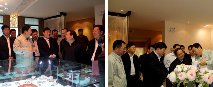 2012年4月6日江西省人民政府省長鹿心社一行在市委書記鄧保生、市長劉昌林等省市領導的陪同下來我司視察工作,鹿心社省長一行參觀了工廠生產車間、國瓷館,詳細了解了公司的生產運營情 況并對公司產品贊不絕口。視察期間,鹿心社省長對公司給予了高度評價:“你們公司為景德鎮(zhèn)爭了光,為江西爭了光,為國家爭了光。"并希望公司能牢牢抓住精品路線,抓住高端市場,搞活機制,繼續(xù)做的更大更好。