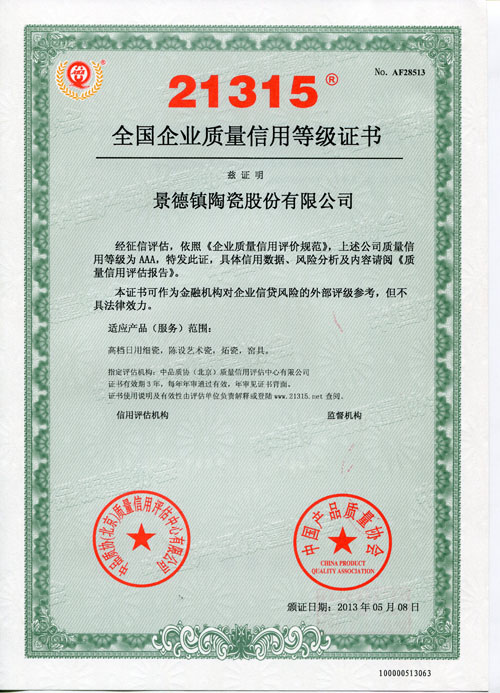 據(jù)了解,榮獲《中國21315質(zhì)量信用等級AAA級證書》的企業(yè)可在網(wǎng)站系統(tǒng)上進行查詢。質(zhì)量信用等級從AAA到D共有10個級別,AAA級是質(zhì)量信用等級的最高級別,意思是產(chǎn)品質(zhì)量信用“非常好”。