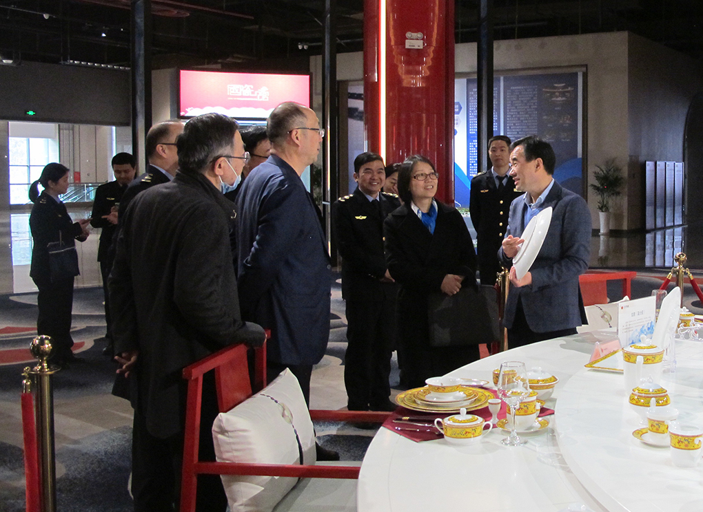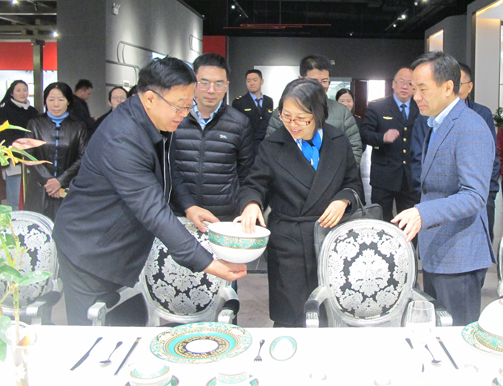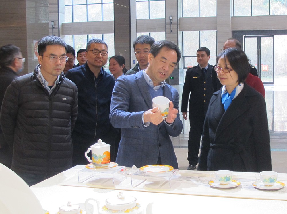 在國瓷館參觀考察期間,周敏建向調(diào)研組一行簡要介紹了集團(tuán)公司發(fā)展歷程。大家邊走邊看,不時駐足拿起產(chǎn)品仔細(xì)品鑒或拍照。周敏建在介紹“國瓷紅葉”產(chǎn)品特色時詳細(xì)講解了陶瓷生產(chǎn)工藝,講述了一套套有關(guān)“國瓷”的故事。