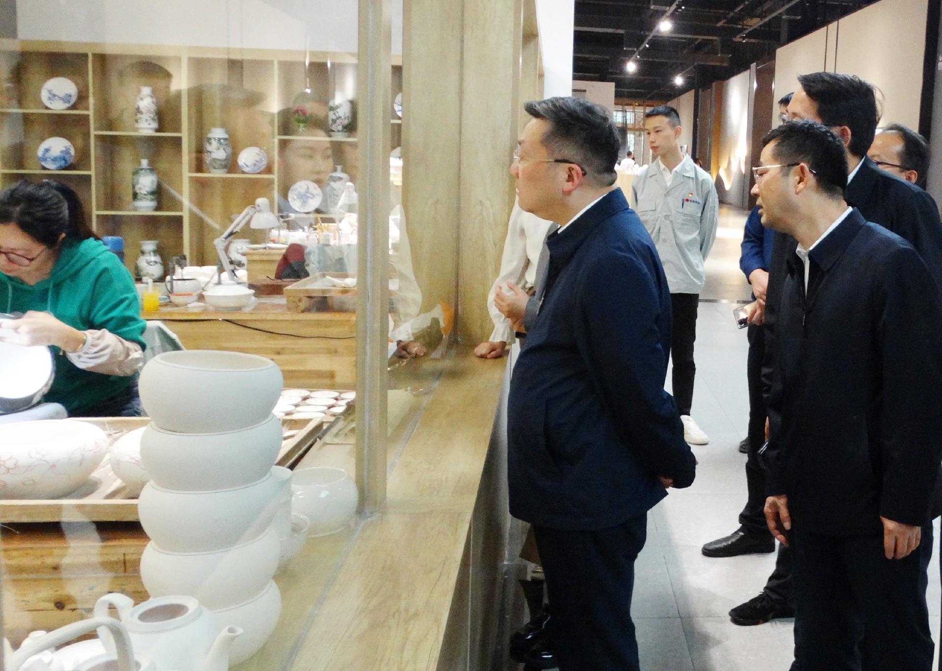 在繪畫展示窗口,工人們正聚精會(huì)神地繪制碗、盤等器皿。陳澎饒有興致地觀看,并連連稱贊她們的技藝,胡軼隨即說道,我們集團(tuán)對(duì)專業(yè)技術(shù)人才非常重視,還相繼出臺(tái)了一系列激勵(lì)措施,陳澎聽后給予了高度肯定和稱贊。